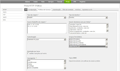 4) A configuração é simples – e a tela acima é auto explicativa. Primeiro você marca o tipo de origem como IP, depois adiciona o range de IP. Na sequência adiciona o site em tipo de destino, marca o tipo de autenticação por grupo e a regra está criada. É possível também complementar a regra conforme abaixo, escolhendo, por exemplo, a função Permitir ou Negar, e ainda direcionar para um determinado filtro de conteúdo.