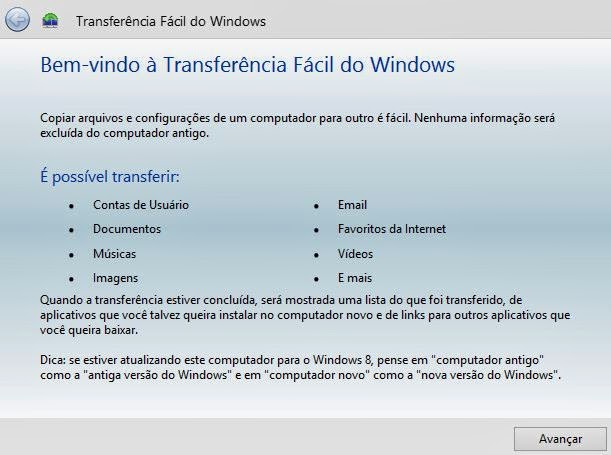 3) Note que diversos documentos pessoais do seu usuário serão transferidos para uma outra máquina qualquer de sua escolha. Pressione Avançar para iniciar o assistente;