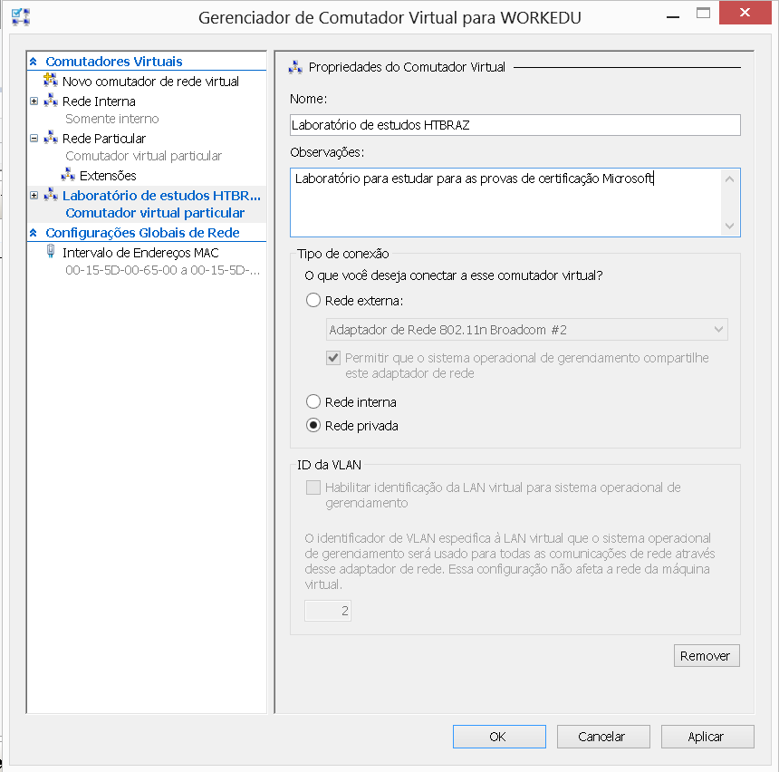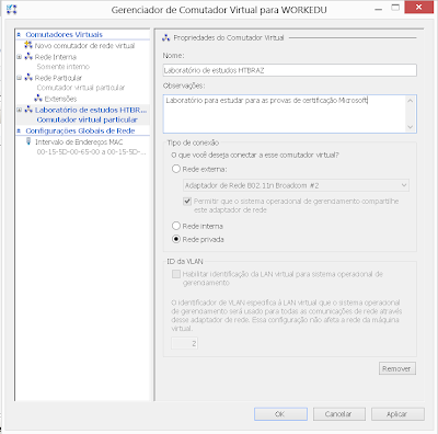3) Preencha as propriedades do comutador virtual conforme a imagem abaixo ou use a criatividade, porém mantenha a opção “Rede Privada” marcada.