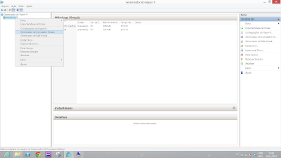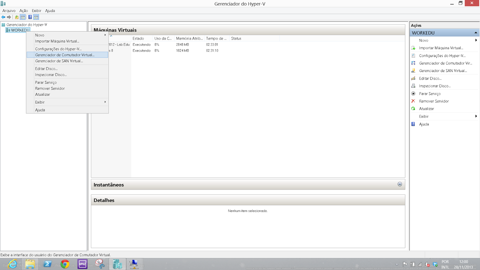 1) Clique com o botão direito no servidor Hyper-V (que no meu caso esta como WORKEDU) e em seguida selecione Comutador Virtual.